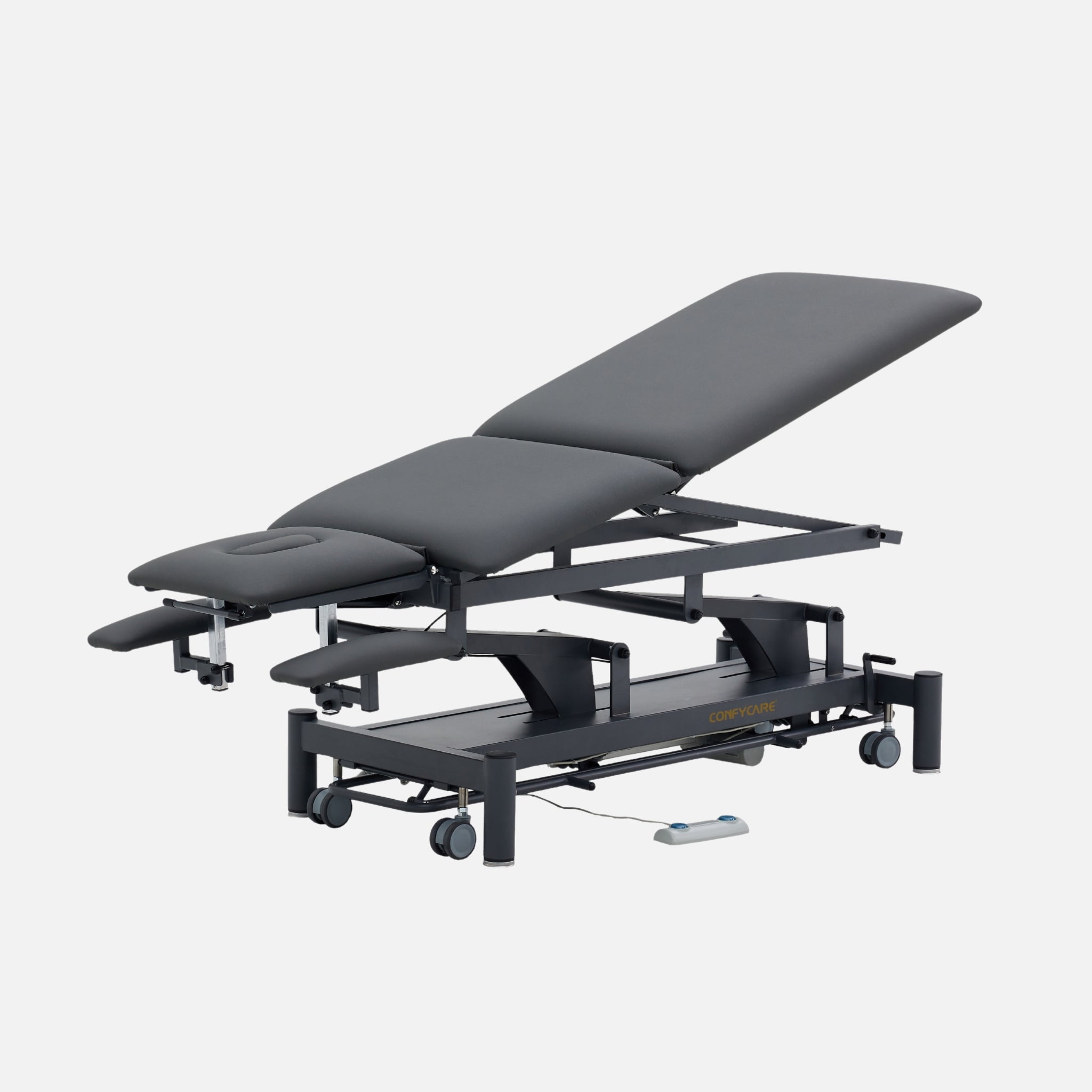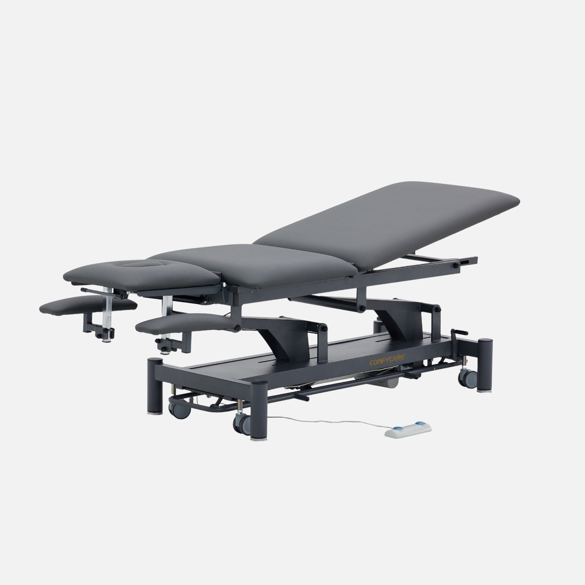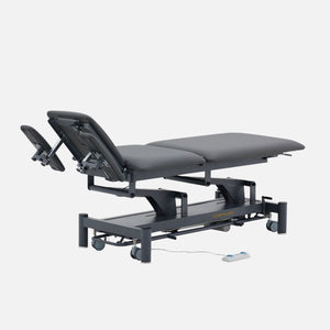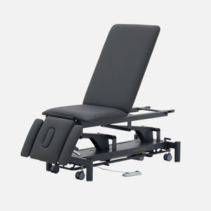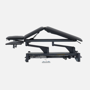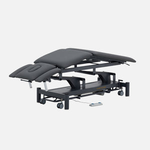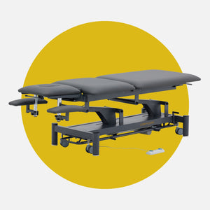 Camilla de fisioterapia de 5 secciones para una amplia gama de tratamientos. Equipada con reposabrazos en cabezal, ajustables en altura para asegurar la mejor posición cuando el paciente está tumbado en posición ventral. Dispone de 2 motores: ajuste de la altura de la camilla y cifosis eléctrica. Equipada de serie con portarrollos de papel.